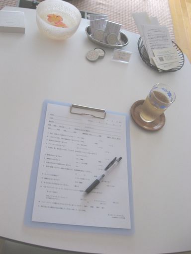 (写真中央)夏は冷たくしたハーブティーをお出ししています。飲みながらお客様シートにご記入ください。差し支えのない範囲で結構です。2回目以降の場合はもっと手短な内容となります。