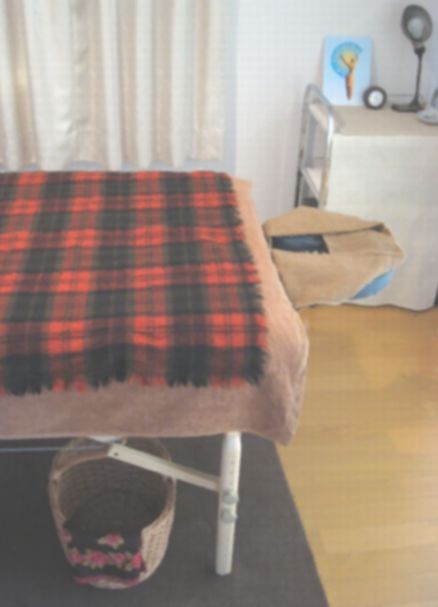 (写真中央)うつぶせの場合にはヘッドレストからお顔を出していただく体勢なのですが、これが苦手な方もいらっしゃると思います。はずしてタオルを枕にしてのトリートメントも可能です。いつでもお申し出ください。ベッド下のカゴにお洋服を入れていただきます。