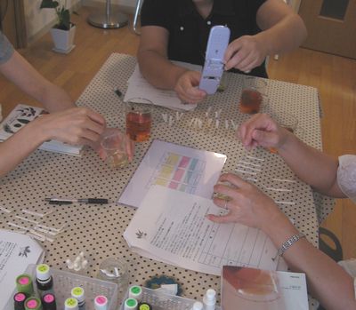 さて、今回みていただきました精油は10数種類、初心者の方もいらしたのによくついてきてくださったと思います(ムリヤリ連れてかれたって?そりゃ失礼)。私はアロマテラピーより先に合成香料による調香を学んでおり、香りに対する刺激にかなり耐性があるもので、気づかず限界を超えてしまうことがあるようなんです。皆さんのお疲れのご様子をみて多すぎたかなーとは思ったのですが(5日に参加いただいたimohamiさんのレポ参照)、やっぱりある程度の数ないと香水作りは面白くない。なので次回もこのくらいの種類はご覚悟ください(反省の念まるでなし)。来月はもう少し涼しいでしょうから換気はしっかりします。
