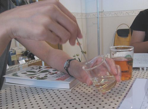 処方が出来上がったら調香ですが、精油はさらさらしているもの、粘度の高いものなど色々ありますので慣れていない方には扱いが少し厄介。前回はそれが心配だったこともあって私が処方をみせていただいて代わりにお作りしていました。しかしまあ、やってみないことには慣れることもできない。ちょっとばかし多く入ったところでとんでもない香りになるわけでもなし、というわけで何人かの方にはご自身で作っていただいたんですが、すぐに「ギャーそんなにビンを傾けちゃ!」とすっとんでいってしまうところ、私は「黙って見守る」ということができないようです。