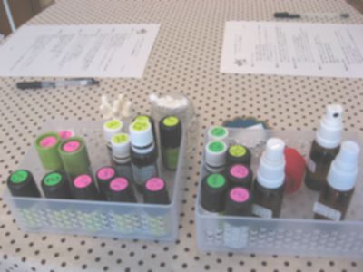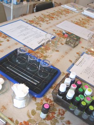 オスマントゥス(キンモクセイ)の他に十数種類の香りをじっくりみていただいたあと、各自使用する精油を選んで処方を組んでいただきます。