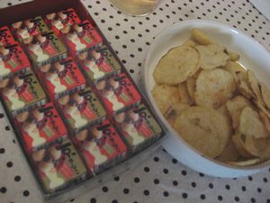 今回の差し入れ。みんなでウケてしまいましたのが、左の「京きなこチロルチョコ」。ヌガーの代わりにお餅が入っている変り種でした。しっかりきなこ味だし、チョコって言うには微妙なお菓子でしたが不思議とあとをひくお味です。ご興味のある方は一度お試しを。